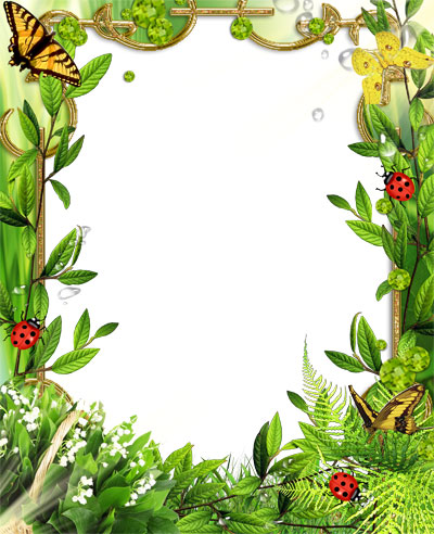 Симпатичная зелёная рамка с божьими коровками и бабочками.