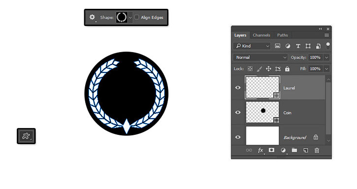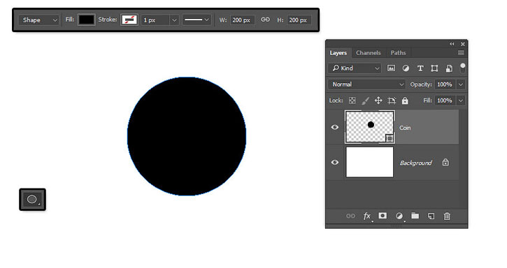 (U) (Овал), проверяем, чтобы на верхней панели был установлен режим Shape (Фигура), и создаем окружность. После этого называем слой «Монета».