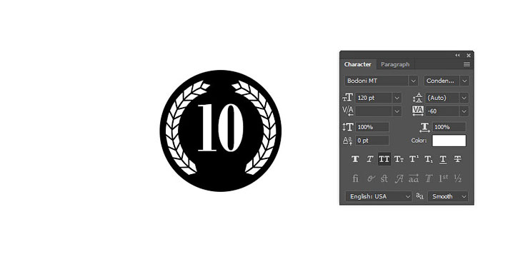 В данном случае использован шрифт Bodoni MT, размер 120 пт, Tracking (Трэкинг) -60.