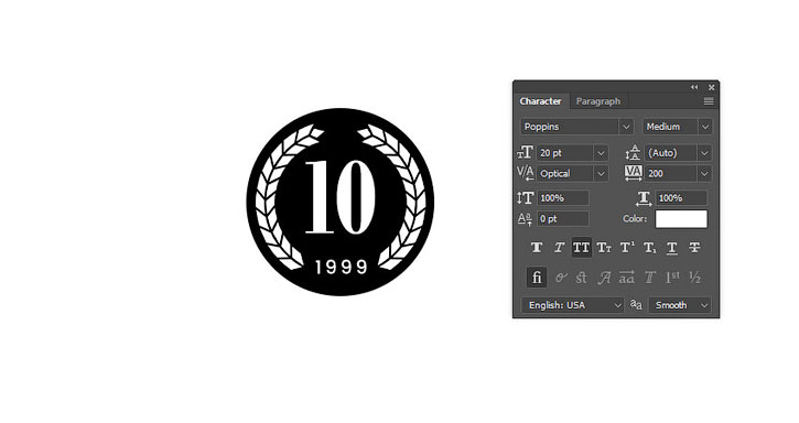 Добавляем еще текст в той части венка, где мы удалили лишние фигуры. В этот раз использован шрифт Poppins, размер 20 пт, Tracking (Трэкинг) 200.