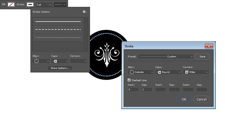 Дублируем (Ctrl+J) окружность для монеты и уменьшаем (Ctrl+T) копию так, чтобы она находилась в центре оригинала. На верхней панели настраиваем параметры копии: отключаем Fill (Заливка), нажимаем на кнопку выбора типа обводки и выбираем More Options (Другие параметры).