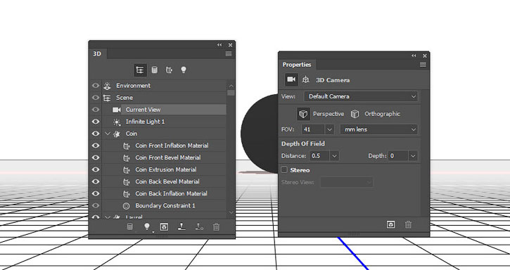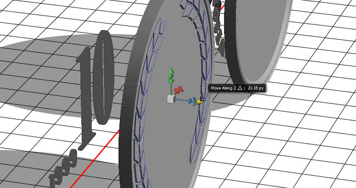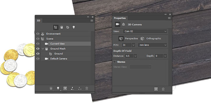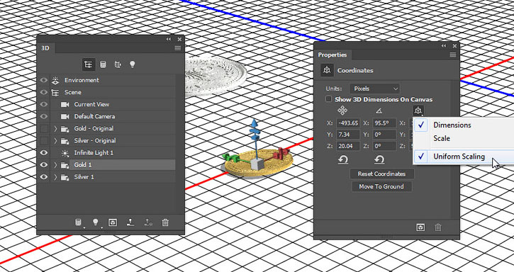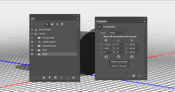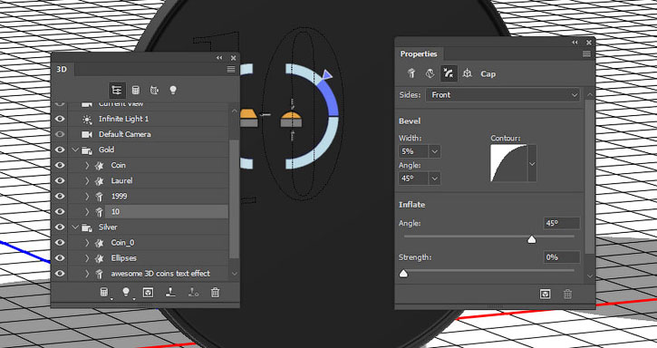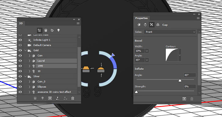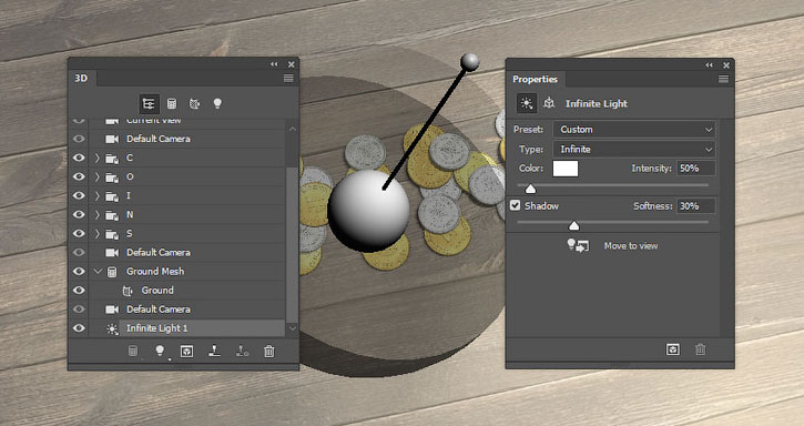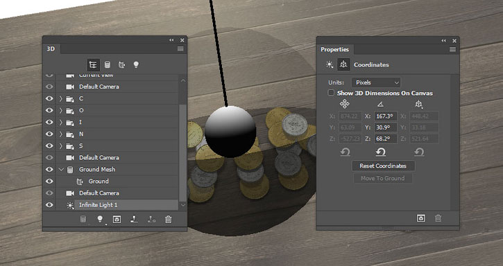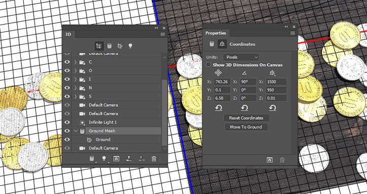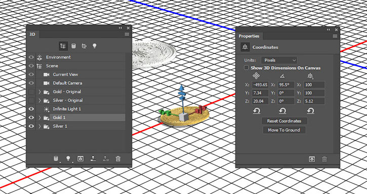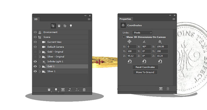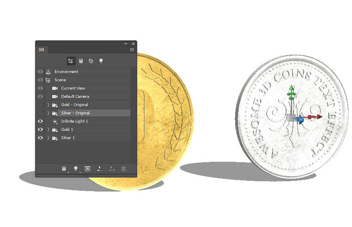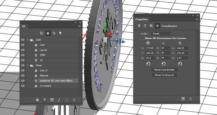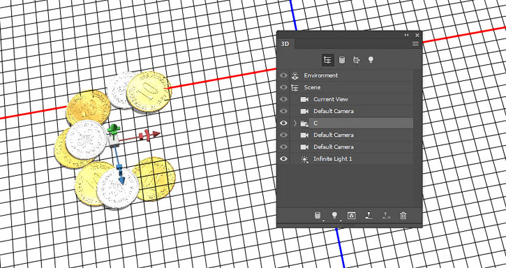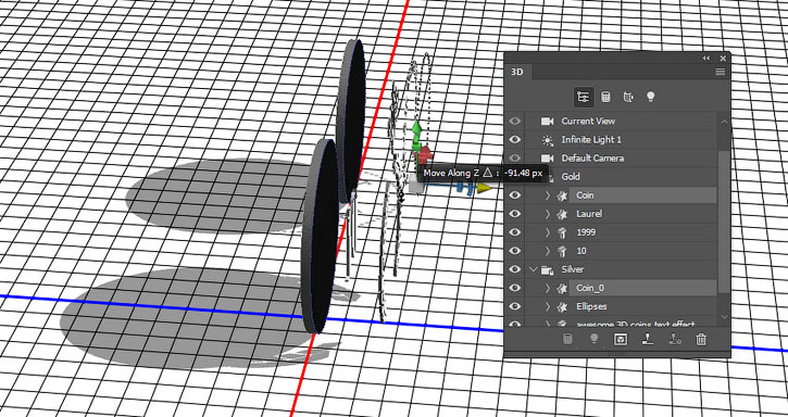 На панели 3D выделяем окружности каждой монеты и активируем инструмент Move Tool