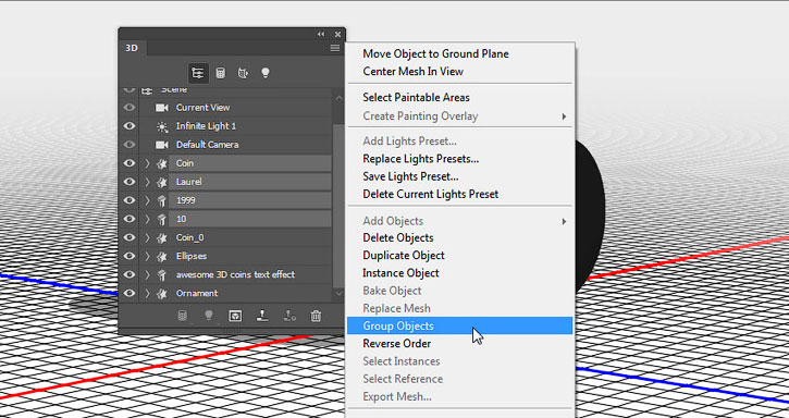 Выбираем все 3D-компоненты первой монеты на панели 3D, в правом верхнем углу нажимаем на кнопку меню и выбираем Group Objects (Группировать объекты).