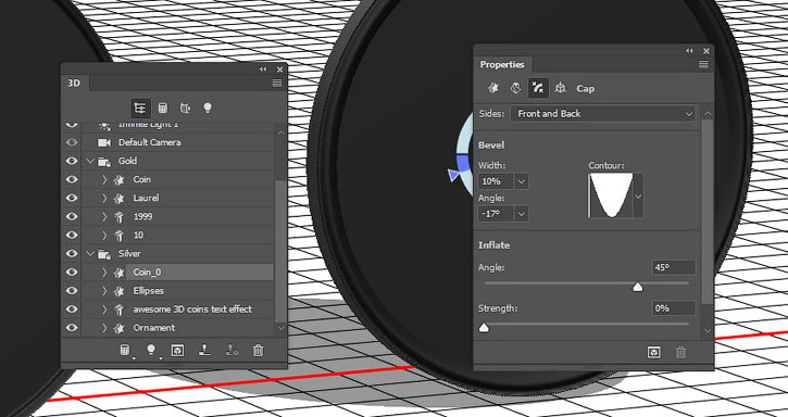 Выбираем окружность серебряной монеты, переходим на вкладку Cap (Капитель). Устанавливаем Sides (Стороны) на Front and Back (Спереди и сзади), Bevel Width (Ширина фаски) – на 10%, Angle (Угол) – на -17 и Contour (Контур) – на Cove-Inverted (Перевернутый контур).