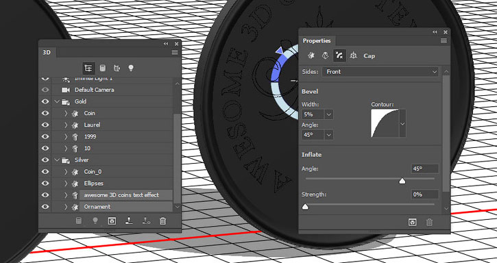 Выбираем текст и орнамент серебряной монеты и устанавливаем Bevel Width (Ширина фаски) на 5% и Contour (Контур) – на Half Round (Полукруг).