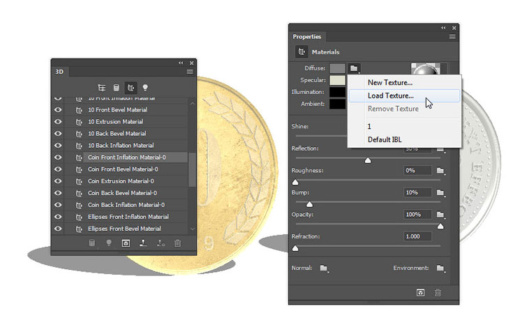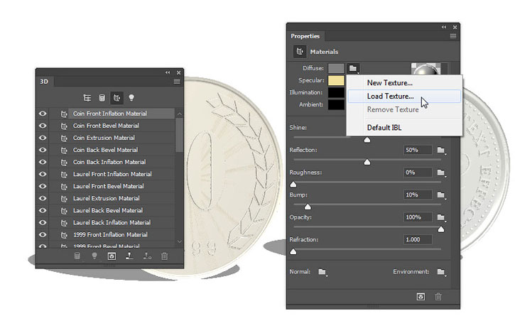 Выбираем Front Inflation Material (Материал передней выпуклости) золотой монеты, нажимаем на кнопку папки напротив Diffuse (Рассеивание) и выбираем Load Texture (Загрузить текстуру). Открываем изображение «2.jpg» из набора с металлическими бесшовными текстурами.