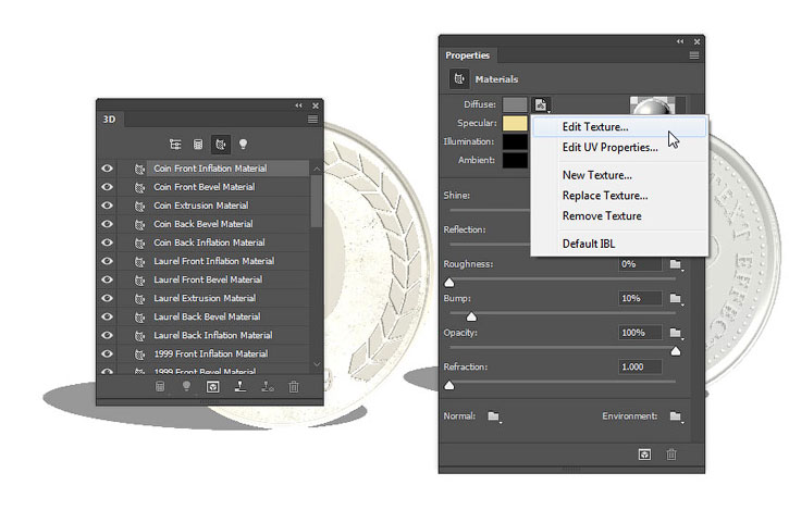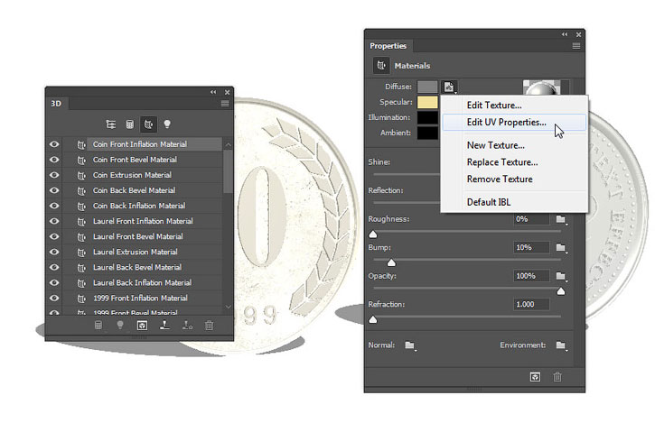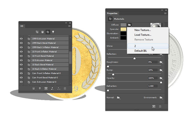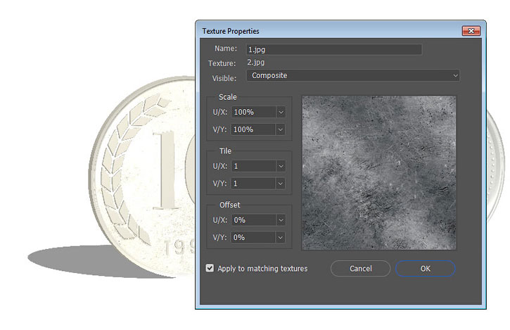 Применяем эту текстуру к остальным материалам серебряной монеты.