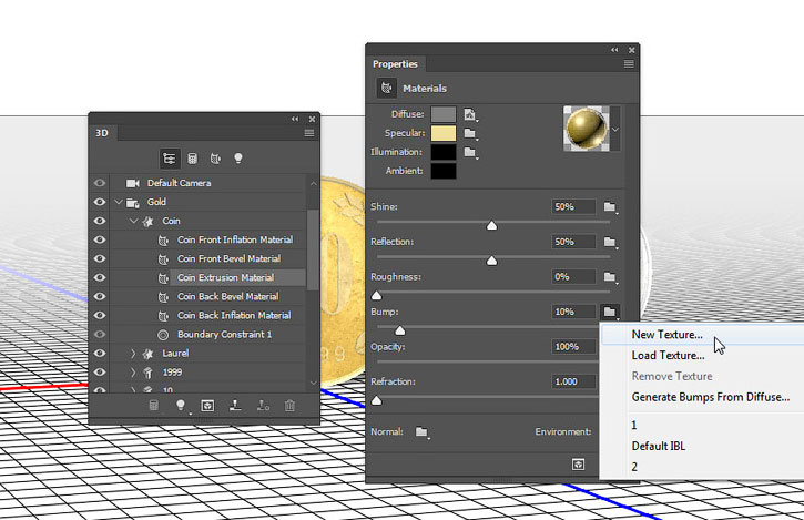 Выбираем Extrusion Material (Материал экструзии) золотой монеты, затем нажимаем на значок папки напротив параметра Bump (Рельеф) и выбираем New Texture (Новая текстура).