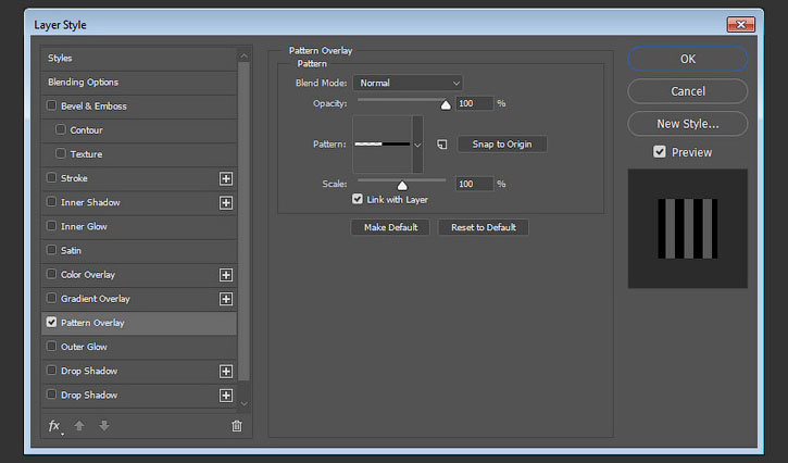Дважды кликаем по копии слоя, чтобы открыть окно Layer Style (Стиль слоя), и применяем Pattern Overlay (Наложение узора). Выбираем узор с вертикальными линиями 10 пикселей.