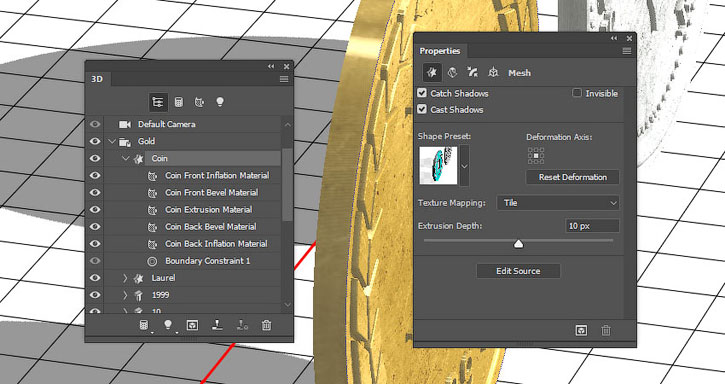 Выделяем остальные компоненты золотой монеты и устанавливаем Extrusion Depth (Глубина экструзии) на 3.