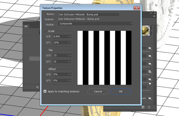 Снова выбираем Extrusion Material (Материал экструзии) золотой монеты и переходим к UV-свойствам параметра Bump (Рельеф).
