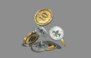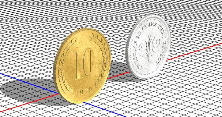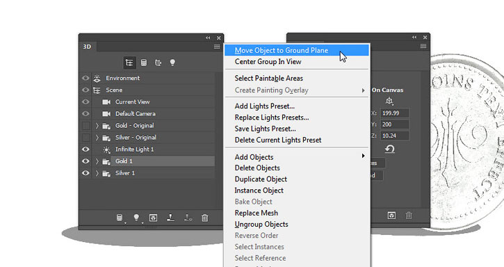 Такие же манипуляции проделываем с серебряной монетой: настраиваем угол поворота по оси Х и перемещаем на плоскость основания.