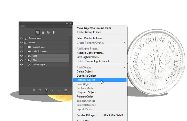 Выделяем обе группы с серебряной и золотой монетами, кликаем по ним правой кнопкой мышки и применяем Instance Object (Создать экземпляры объектов).