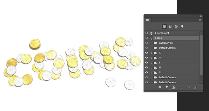 Затем трансформировали их в 3D-слои, настроили и добавили материалы. После этого продублировали монеты и распределили их так, чтобы создать очертания слова.