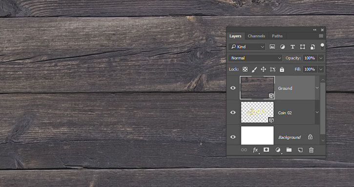 Открываем изображение с досками, копируем его и вставляем над 3D-слоем с монетами. Называем слой с текстурой «Поверхность» и переходим 3D – New Mesh from Layer – Postcard (3D – Новая сетка из слоя – Почтовая открытка).
