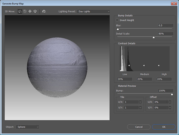 Настраиваем параметры в окне Generate Bump Map (Создать карту рельефа) и нажимаем ОК.