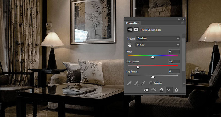 Добавляем корректирующий слой Layer – New Adjustment Layer – Hue/Saturation (Слой – Новый корректирующий слой – Цветовой тон/Насыщенность). Устанавливаем Saturation (Насыщенность) на -60, сохраняем (Ctrl+S) файл и закрываем его.