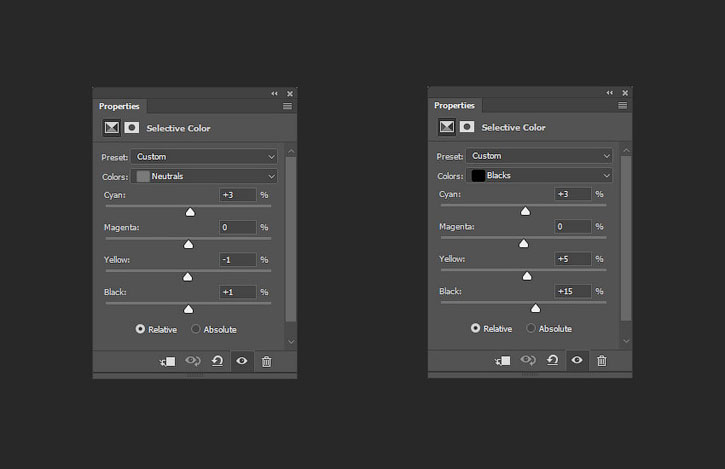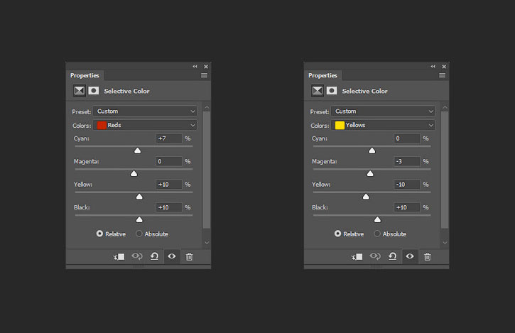 Добавляем корректирующий слой Selective Color (Выборочная коррекция цвета) и настраиваем его: