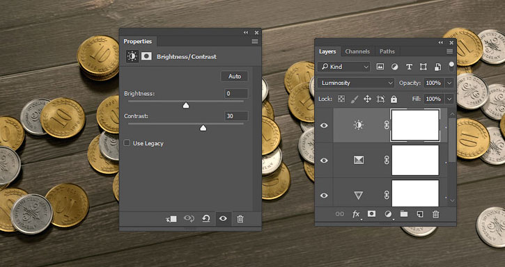 Добавляем корректирующий слой Brightness/Contrast (Яркость/Контрастность), переключаем режим смешивания слоя на Luminosity (Яркость) и устанавливаем Contrast (Контрастность) на 30.