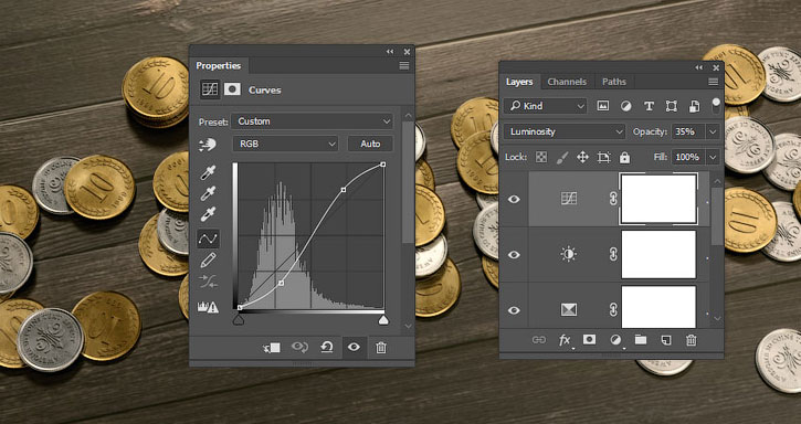 Добавляем корректирующий слой Curves (Кривые), переключаем режим смешивания на Luminosity (Яркость) и устанавливаем непрозрачность на 35%, затем придаем кривой S-образную форму, чтобы увеличить контрастность.