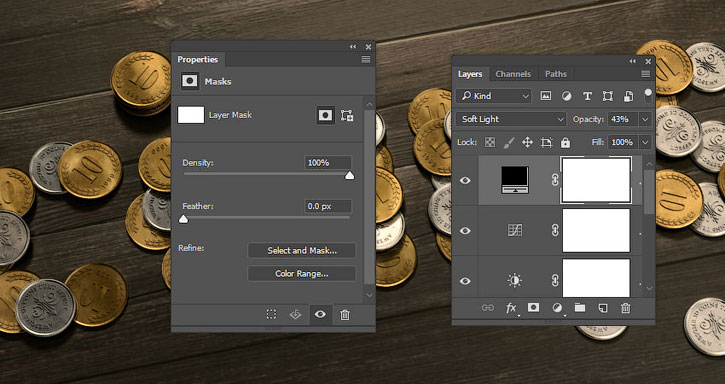 Добавляем слой-заливку Solid Color (Цвет) и выбираем для него черный цвет. Меняем режим смешивания на Soft Light (Мягкий свет) и уменьшаем непрозрачность до 43%.