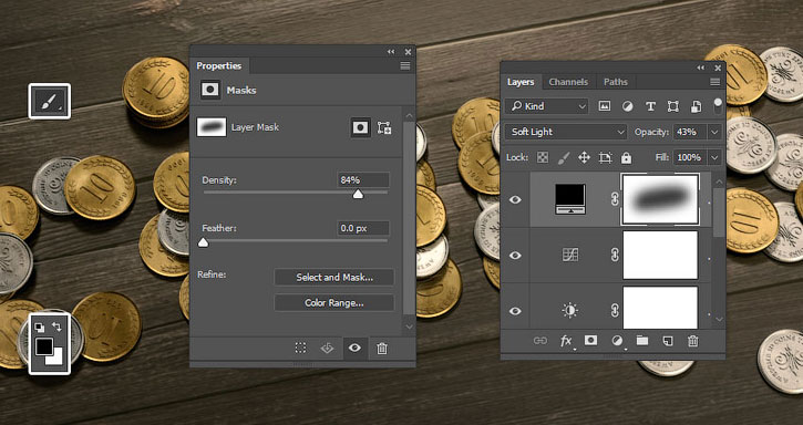 На панели слоя кликаем по миниатюре маски слоя-заливки, берем Brush Tool