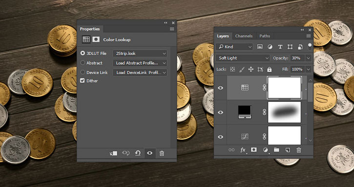 Добавляем корректирующий слой Color Lookup (Поиск цвета) и на панели свойств устанавливаем 3DLUT File (Файл 3DLUT) на 2Strip.look.