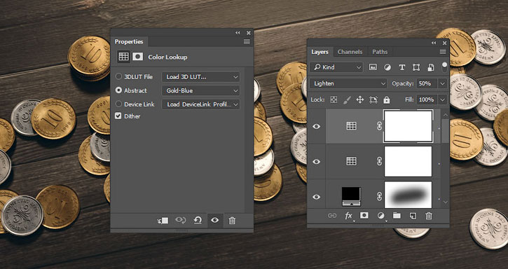 Добавляем еще один корректирующий слой Color Lookup (Поиск цвета) и устанавливаем Abstract (Абстрактный) на Gold-Blue.