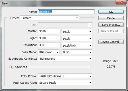 Начинаем с создания нового документа File - New (Файл - Новый) с такими параметрами: