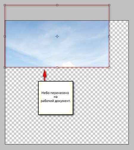 После этого, активируем Move Tool  (Перемещение) (V), хватаем небо левой кнопкой мышки и перемещаем на рабочий документ. Размещаем, как показано ниже: