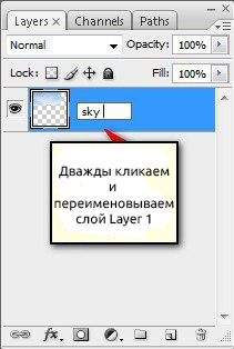 Переименовываем слой на "sky 1". Для этого дважды кликаем левой кнопкой по названию слоя: "layer 1" (на панели слоев).