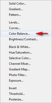 Далее создаем корректирующий слой Color Balance (Цветовой баланс). Вы найдете его в том же меню Create new fill/adjustment layer (Создать новую заливку/корректирующий слой).