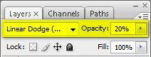 Меняем его режим смешивания на Linear Dodge (Add) (Линейный осветлитель (Добавить)) и уменьшаем Opacity (Непрозрачность) до 20%.