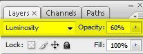 Изображение стало черно-белым, поэтому меняем режим смешивания корректирующего слоя Gradient map (Карта градиента) на Luminosity (Свечение) и уменьшаем Opacity (Непрозрачность) до 60%.