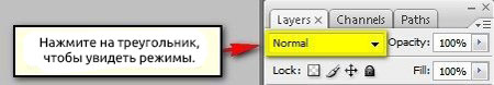Чтобы сменить режим смешивания, просто кликаем по выпадающему меню со словом Normal (Нормальный) в верхней части панели слоев. Opacity (Непрозрачность) находится рядом.