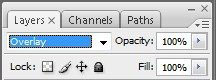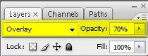 Из выпадающего меню выбираем режим смешивания Overlay (Перекрытие), Opacity (Непрозрачность) должна быть на 100%.