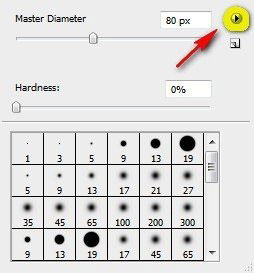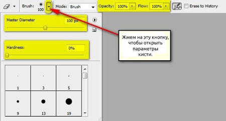 Правым щелчком по рабочему полотну вызываем меню выбора кисти и жмем на кнопку с маленьким треугольником: