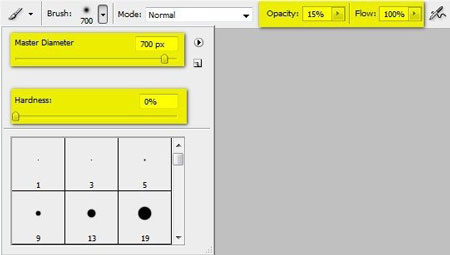 И наконец, осветляем центральную область. Создаем новый слой (Ctrl/Cmd+Shift+N) выше "darken 3". Активируем Brush Tool  (Кисть) (В) и вводим следующие параметры: