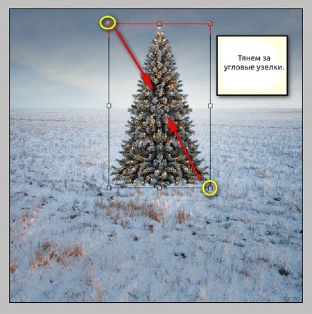 Называем слой с елкой "Xmas tree". Активируем трансформацию (Ctrl/Cmd+T) и уменьшаем дерево, как показано ниже: