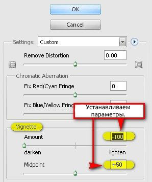 Выделяем все слои, которые относятся к человеку, и группируем их (Ctrl/Cmd+G). Называем группу "Man". В этом шаге мы научимся создавать виньетку, которая поможет сфокусировать внимание на центральных элементах композиции. Для начала создаем новый документ File - New (Файл - Новый) с такими же настройками, что и для основного документа (Шаг 1). Обратите внимание, что фоновый слой должен быть БЕЛЫМ. После этого переходим Filter - Distort - Lens Correction (Фильтр - Искажение - Коррекция дисторсии). Находим вкладку Vignette (Виньетка) и используем такие настройки: