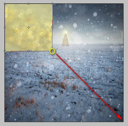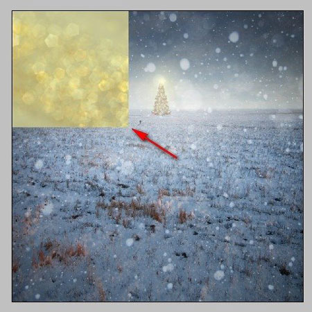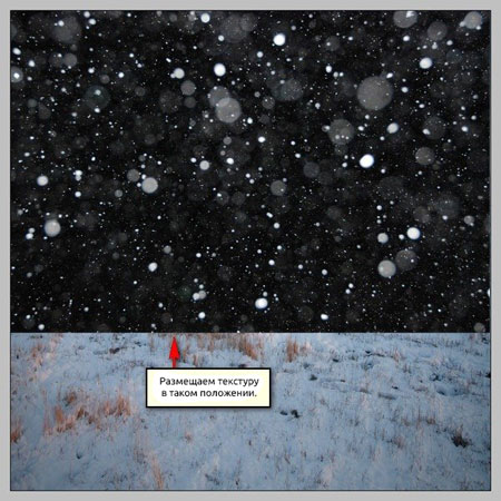 Чтобы усилить рождественскую атмосферу, добавим текстуру снега. Открываем стоковое изображение Snowing texture. Активируем Move Tool  (Перемещение) (V) и перетаскиваем ее на рабочий документ. Размещаем на полотне, как показано ниже: