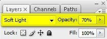 Меняем режим смешивания слоя со снегом на Soft Light (Мягкий свет) и уменьшаем Opacity (Непрозрачность) до 70%.