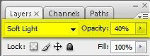 Меняем режим смешивания текстуры на Soft Light (Мягкий свет) и уменьшаем Opacity (Непрозрачность) до 40%.