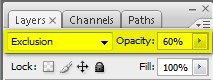 Убедитесь, что корректирующий слой Solid Color (Цвет) находится выше группы "Snow texture". Меняем его режим смешивания на Exclusion (Исключение) и уменьшаем Opacity (Непрозрачность) до 60%.