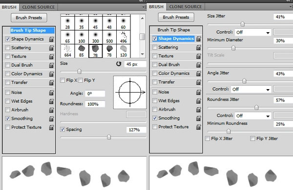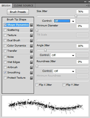 Создайте новый слой над всеми слоями (Shift + Ctrl + N), выберите основную кисть размером 4 px, с красным цветом (#ff0000) и установите для нее настройки, как показано ниже: