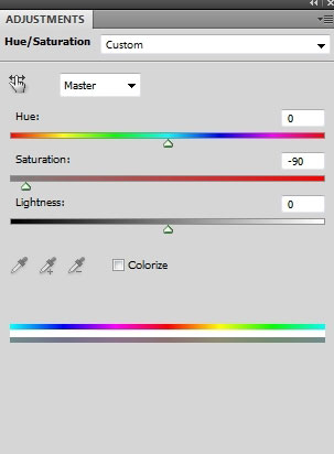 Уменьшите насыщенность слоя с моделью при помощи корректирующего слоя Цветовой тон/Насыщенность с обтравочной маской (Слой – Новый корректирующий слой – Цветовой тон/Насыщенность) (Layer > New Adjustment Layer > Hue/Saturation).