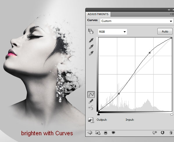 Осветлите слой с моделью, добавив к нему корректирующий слой Кривые (Слой – Новый корректирующий слой – Кривые) (Layer > New Adjustment Layer > Curves).