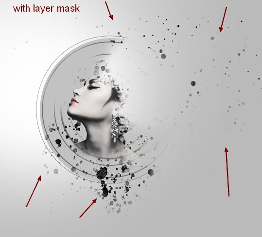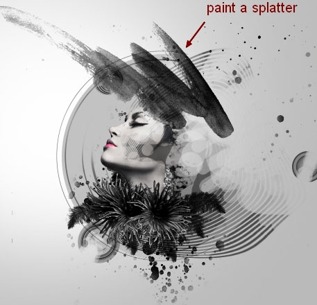 Под слоем с моделью создайте новый слой (Shift + Ctrl + N), установите для цвета переднего плана черный и кистью с брызгами нарисуйте всплески вокруг модели и кругов (я использовал кисть с номером 353).