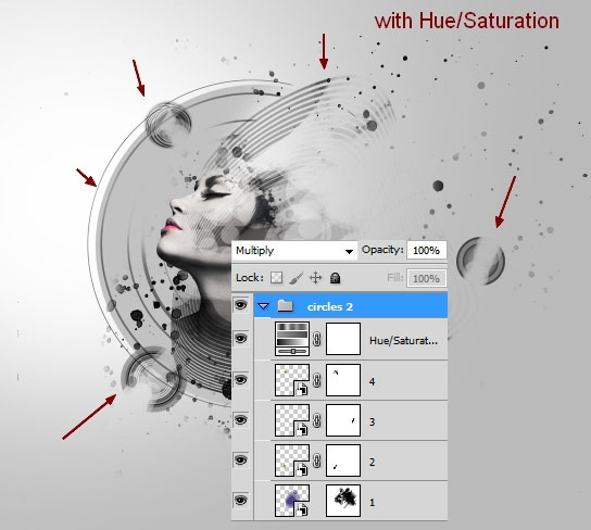 Выделите все слои с кругами, которые создали в шаге 10 и в шаге 12 и поместите их в группу (Ctrl + G). Измените режим наложения этой группы на Умножение (Multiply). Слои в этой группе пронумеруйте от 1 до 4. К слою 4 добавьте корректирующий слой Цветовой тон/Насыщенность (Слой – Новый корректирующий слой – Цветовой тон/Насыщенность) (Layer > New Adjustment Layer > Hue/Saturation).