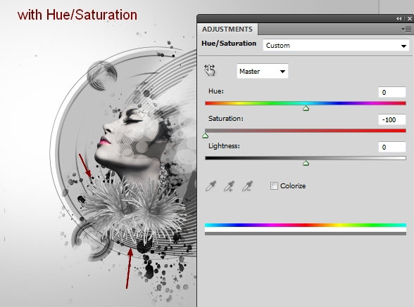 Поместите слои с цветами в отдельную группу (Ctrl + G) и установите для нее режим наложения Нормальный (Normal). Используйте корректирующий слой корректирующий слой Цветовой тон/Насыщенность, чтобы изменить оттенок цветов на черно-белый (Слой – Новый корректирующий слой – Цветовой тон/Насыщенность) (Layer > New Adjustment Layer > Hue/Saturation).